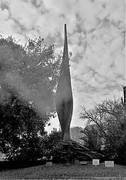 In a letter to the Giacomo Matteotti Foundation, the sculptor indicated the horizontal element ... through the exasperation of form and matter, wants to signify maceration and physical destruction, understood in a universal sense, in a tragic moment in history. The vertical element signifies the ideal ascending towards space, through a sprouting, pure, lyrical form, a symbol of clarity and hope. Vivarelli himself, as a former Italian soldier, had been imprisoned and deported north by the Nazi forces in 1943.[4]