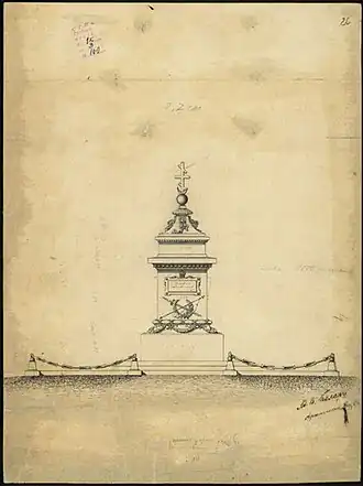The monument is 13 m high, made of grey Balkan granite and designed by Czech architect Antonín Kolář. The bronze bas-relief of the head of Levski, part of the monument, was created by Josef Strachovský (or, according to other sources, Austrian sculptor Rudolf Weyr), whereas Italian Abramo Peruchelli did the stonecutting work. It was inaugurated on 22 October 1895, but was planned and worked on ever since the Liberation of Bulgaria in 1878, the construction being hindered by a chronic lack of funds and negligence, and taking a whole 17 years. This ignited a wave of indignation among the Bulgarian intellectuals of the time, with the poet Konstantin Velichkov even branding this carelessness in an 1881 poem (see text).