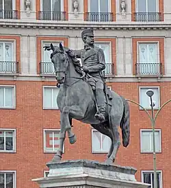 A work by Andrés Aleu, the bronze statue is 4.55 meters high, and it weighs 8,280 kilograms.[1] Reportedly the first equestrian statue cast in Spain since the 17th century,[2] the bronze was cast in Seville,[3] from cannons loaned by the Spanish State.[1] Additional costs were funded via a nation-wide popular subscription.[1] On the longitudinal sides of the stone pedestal there are two reliefs illustrating important episodes of the general's life,[1] authored by Pablo Gibert.[2]