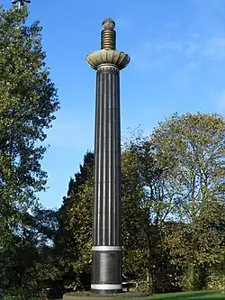 The monument stands on a white ashlar base.[6] It consists of a shaft about 18.3 metres (60 ft) high surmounted by a lighting bowl. The core of the shaft is reinforced concrete, which is overlaid with fluted and polished black granite. The lighting bowl is in gilded bronze and glass.[7] The shaft tapers, and is also slightly curved "to correct the optical illusion of being less in diameter in the centre than at the top of the shaft".[2] There are two bands around the shaft decorated with chevrons and acanthus. At the top of the shaft is a fluted glass bowl. Arising from this is a ribbed cap bearing a spherical-shaped lamp.[6] On the base of the shaft is an inscription reading as follows.[8]