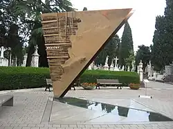 Under commission from Rimini's municipal government,[7] Arnaldo Pomodoro sculpted Fellini's funerary monument by the cemetery's entrance.[2][8] Known as La grande prua (The Great Bow),[8][9] the monument is an inverted bronze double-triangle, affixed by a narrow point to the ground.[10] It takes the form of a ship's bow above a water basin,[9][11] to which water is channelled from the monument itself, with the water system operated from an underground technical room. In the words of Matteo Sintini, an architect, the structure yields a dramatic "impulse of verticality".[6] The monument is inspired by the nautical themes in Fellini's films Amarcord (1973), set in Rimini, and And the Ship Sails On (1983),[9][7] and described by Pomodoro as "cut[ting] an ideal path through the land, the water, the air: for me, it represents the greatness and very glory of Fellini's work".[7] Fellini is buried with his wife, actress Giulietta Masina, and their son Pierfederico, who died a few days after birth.[6][12]