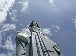 On 21 December 1983, during the bicentennial year of the birth of Simón Bolívar, the Monumento a la Virgin de la Paz was inaugurated, with the liturgical blessing of the newly ordained cardinal José Alí Lebrún Moratinos.[9] The statue shows the Virgin Mary in a blue robe, and its construction had lasted 18 months,[21] carried out by the sculptor Manuel de la Fuente and the engineer Rosendo Camargo, with support of Juan Francisco Hernández. The monument sits on a steel structure, which includes the skeleton of the hollow concrete sculpture. It has a weight of 1,200 tonnes spread over 46 meters high, of which 8 tonnes is the weight of the head alone. The cost of the monument was 9 million bolívares.[20]