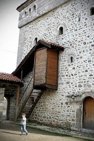 Among the residential houses, the most distinctive were Kullas.[3][42] The word Kulla from Albanian, Kule from Turkish, and kуле from Serbian, in English means Tower. They were built in the whole territory of Kosovo, but the most distinct ones were built in villages and towns of Dukagjini/Metohija region.[42] These fortified stone houses were built by at the end of 17th and continued to the 18th, 19th and even in the early 20th century. Kullas purpose was for protection, considering the constant fighting.[1] Therefore, they were placed in strategic position within the yard, thus offering a full sight of the surrounding environment.[2][23] Kullas are special because of their form, construction, yard entrance, stone gallery, shoot holes, men room, window openings and ceiling.[23] They were constructed from prehistoric antiquity that is characterized with special architectural structure not only in the Balkan cultural area, but also in Europe.[3]