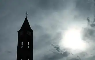 Sahat Kulla (The clock tower) is the city's clock, built in the 19th century by Jashar Pashe Gjinolli.[56] It is 26 meters high and in hexagon's shape.[56] The original object was damaged by the fire, but was reconstructed later. It's protected by the state since 1867.[56] In 2001 its original bell, which was brought from Moldavia, was stolen.[56] KFOR changed its old mechanism with a new electric one.[56] Considering Kosovo's problems with electricity supply, the clock tower barely tells the right time.[56]