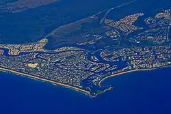 ![]() Aerial photo of Mooloolaba showing river mouth and canals, 2007 | |