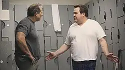 ![]() Jay (Ed O'Neill) and Cameron (Eric Stonestreet) at the gym's locker-room | |