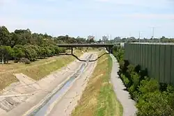 In 1950s and 1960s the Melbourne and Metropolitan Board of Works realigned and concreted the creek from Strathmore to Flemington Road, in an attempt to stop periodic flooding.[3] The modifications were part of extensive urban development of the lower floodplain. For much of its length through the northern suburbs it is now characterised as a concrete stormwater drain that parallels the Tullamarine Freeway.