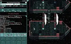 Moonring is a 2D role-playing video game in which players explore an open world and procedurally-generated dungeons in the land of Caldera. The user interface is split between a top-down depiction of the world on the right and a menu on the left that displays a text-based logs of game events and player statistics.[1] Events in the game are turn-based, with characters and enemies moving at the same pace as the player. Interaction and combat is undertaken by bumping into other objects or enemies.[2] Health is managed with a system in which characters have a health bar and regenerating 'poise' that buffers against attacks before taking health damage.[3] The game features a skill and progression system based on completing devotional tasks from five gods that represent a particular skill. Completing these tasks, such as discovering areas, defeating certain enemies or undertaking certain actions, awards the player points which can be spent to unlock skills and increase skill levels.[2] Players can engage in parser-based dialogue with all non-player characters by typing in key words, with highlighted words in responses providing hints on dialogue topics.[1]