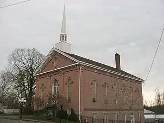 Moore's Hill United Methodist Church, also known as Methodist Episcopal Church, is a historic Methodist church located at 13476 Main Street in Moores Hill, Dearborn County, Indiana. Although it was built in 1871, the congregation was founded in 1818. [2] It is a simple one-story, gable front, brick building with Greek Revival and Italianate style design elements. It rests on a limestone foundation and has four Doric order pilasters on the front facade.[3]: 5