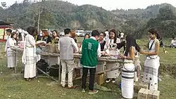 Galo people dress up in their finest white traditional clothing for the festival. A local drink called Apung/Poka (an alcoholic beverage popular in the state prepared by fermentation of rice) is generally distributed among the participants in a bamboo cup and a variety of meals are served, made of rice which is known as Aamin which contains meat and bamboo shoot.[3]
