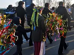 Walking with the Copse is a ritual in which pine branches, twigs or even entire small trees (pine or spruce) – adorned with ribbons, handmade ornaments, egg shells or flowers – are carried from house to house. In some variations of the ritual, a doll is tied to the top branch; in others, a local girl accompanies the copse (hence "walking with the Queen"). The copse is usually carried by girls, who walk from house to house, dance, sing and extend best wishes to the hosts. Some sources relate that the group also collected donations. Today the ritual often takes the form of bringing a decorated copse to the village after the ritual of drowning Morana is completed. This type of a two-part ritual (destroying the effigy and then returning with the copse) had been observed in the Opole region, the western parts of Kraków Voivodeship, Podhale, Slovakia, Moravia, Bohemia, Lusatia and Southern Germany (Thuringia, Franconia).[8] In the 19th century Oskar Kolberg noted that the copse had been carried around as a standalone custom (without the prior destruction of Morana) around Kraków and Sandomierz, as well as in the regions of Mazovia (on Easter Tuesday) and Lesser Poland (beginning of May or the Green week).[9]