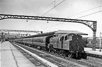 Nationalisation of the UK railway network in 1948 saw British Railways take over control of the station and heralded an era of significant changes. The first of these came in February 1951, when the EMU sets were withdrawn and scrapped, after more than 40 years of service. Steam push-pull sets replaced them, but in 1953 electric working was reinstated, still at 6600 V AC and using the same infrastructure, but this time at a 50 Hz frequency. Three EMU sets built in 1914 and formerly used on the Willesden Junction to Earls Court route in London were brought in to run the service, and a fourth was added in 1957.[3] Another notable change occurred in September 1958, when the former LNWR terminus at Euston Road was closed to regular passenger traffic at the end of the summer timetable.[9] The local services from Lancaster and Carnforth via Bare Lane henceforth followed the same route as the Irish Boat trains into Promenade, leaving Euston Road to be served only during the peak summer season between June and September until 1962. Summer traffic was by this time slowly declining (due to the rise in private car ownership and increasing availability of foreign package holidays), but there were still sufficient numbers visiting Morecambe in 1959 to require more than 20 scheduled and excursion trains to and from Euston Road and a similar number from Promenade.
