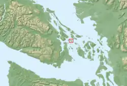 Moresby Island has an elevation of 148 meters (485 feet 6 inches) above sea level at its highest point,[1] and has a total land area of 3.22 sq. miles.[2] The island is 3.7 km (2.3 mi) in length, and is 2.2 km (1.4 mi) across.[3]: 9 The island was first settled in 1863. It was named for Rear Admiral Fairfax Moresby, who was the naval commander-in-chief of the Pacific Station of the Royal Navy between 1850 and 1853, as was Fairfax Point at the island's southern tip[4]: 342 and the other Moresby Island in Haida Gwaii. During the 1880s, land was cleared by Capt. H. J. Robertson, then owner, in order to plant fruit trees.[5] In 1940, the island again changed hands.[6]