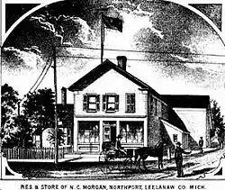 The Morgan–Copp–Mervau Building was built in three sections.[2] The first, a single-story building fronting on Nagonaba, was constructed in 1880 as a grocery and dry goods store. The store was owned by Northport native N. C. Morgan and his wife Abbie Voice.[3] An attached two-story section was built on the rear in 1881-83; this served as the Morgans' home. The Morgans moved to Sault Ste Marie in 1887.[4] The two-story section was extended to front onto Mill Street some time before 1905; this section was used for quite some time as Mervau's drugstore. A third section, built diagonally to front onto the Nagonaba/Mill intersection, was built in 1927/28.