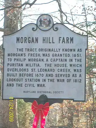 - Morgan Hill Farm, Calvert County, including undated photo, at Maryland Historical Trust