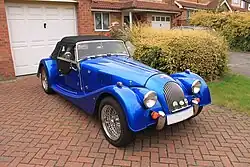The Morgan Roadster is a model produced by the Morgan Motor Company. It was introduced in 2004, replacing the Morgan Plus 8. The car is identical to its predecessor except for new, modern Ford V6 mechanicals. The new engine develops similar power, though less torque,[1] and is slightly lighter than the Rover V8 which results in increased performance and better fuel economy. Air conditioning is now standard on U.S. models. Like its predecessor, the chassis consists of a standard ladder frame design[2] and is built from galvanised steel with five tubular or box section cross members. The body is built of steel and aluminum around an ash frame. The suspension is a traditional Morgan slider type up front and solid axle/leaf spring at the rear.