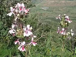 The corolla is pale purple or pink with a darker area on the lower lip. The tube is long and narrow, 35–45 × 1–3 mm, with a slightly swollen throat. The limb is deeply divided into lobes measuring 10–15 × 6–7 mm. The corolla tube is densely glandular-hairy, with the limb less hairy both inside and outside. The species has two fertile stamens, with filaments about 7 mm long, each bearing a tuft of hairs just below the anthers. The anther lobes are subequal, the longer measuring 2 mm and the shorter 1.7 mm. Two minute, heart-shaped staminodes are inserted 2–3 mm below the corolla mouth on the anterior side. A single three-lobed nectary is located at the base of the corolla tube on the anterior side. The style slightly exceeds the stamens, and the stigma is disc-shaped.