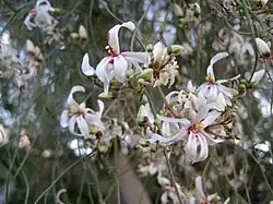 Moringa peregrina is a small deciduous tree, 6-10 m tall, with large leaves and thin pendulous branches. The tree blossoms twice a year; in Spring and in Autumn. Its flowers are five petaled, white or streaked red or pink. Its fruits are distinctive and can be seen hanging from its branches throughout the year. The fruits are narrowly cylindrical, up to 30 cm long and marked with deep longitudinal grooves. When ripe they split into three valves shedding the large whitish seed, known as the behen-nut.[4]