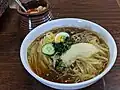 The raengmyon from Hamhung can be separated into two types: bibim-raengmyon, served without broth but mixed with chili paste, and mul-raengmyon, served in a clear broth that typically combines beef broth with dongchimi (radish water kimchi).[19][20][21] While the broth is different, the strength of Morioka reimen is close to that of Hamhung raengmyon but with thicker noodles.