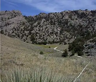 On October 19, the Martin Company was about 110 miles (180 km) further east, making its last crossing of the North Platte River near present-day Casper, Wyoming.[45] Shortly after completing the crossing, the blizzard struck. Many members of the company suffered from hypothermia or frostbite after wading through the frigid river. They set up camp at Red Bluffs, unable to continue forward through the snow. Meanwhile, the original scouting party continued eastward until it reached a small vacant fort at Devil's Gate, where they had been instructed to wait for the rest of the rescue party if they had not found the Martin Company. When the main rescue party rejoined them, another scouting party consisting of Joseph Young, Abel Garr, and Daniel Webster Jones was sent forward. The Martin company remained in their camp at Red Bluffs for nine days until the three scouts arrived on October 28; 56 members of the company had died while they waited. The scouts urged the emigrants to begin moving again. During this interval, the party was met by Ephraim Hanks, bringing meat from a recently slaughtered buffalo. The meat likely saved many lives as the nutritive value was much higher than that of the other supplies. He also performed many blessings and helped in some amputations to stop the progression of the frostbite and gangrene that would have otherwise killed more members of the company. Three days later the main rescue party met the Martin Company and the Hodgett and Hunt wagon companies, and they helped them on to Devil's Gate.[46][47][48]