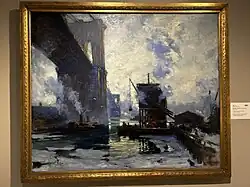 In Seeing America, Gallali stated that Morning on the River illustrates the “untamed wilderness” of the modern city in America by the early 20th century.[4] It is emphasized through the depiction of the Brooklyn Bridge, as it is considered as the “positive symbol of America's destiny.”[4] As the bridge is viewed from below, its giant, magnificent, Gothic[4] structure is revealed to the viewers, making it appears to be a “titanic monster”[4] of industrialization rather than its usual elegant and modern image of being an” engineering marvel.”[4] As a Norwegian-born American artist, Lie's personal interest in winter landscapes is also merged into this painting.[5] It is visible through the heavy use of tinted blue to depict the bustling sky and smoke which symbolizes the vibrant industrial activity happening.[6]