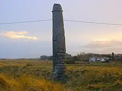 The Maiden Tower, a square tower standing 60 foot high, tapering towards top, with an internal spiral staircase, was built during the reign of Elizabeth I, the Virgin Queen. The name's association with the queen, who came to the throne in 1558, is mentioned as a conjecture in his time by Sir William Wilde in his book The Beauties of the Boyne ... (1849). The tower was already in existence by 1582 when it was proposed to build at Ringsend a tower of "such height and strength as shall be of a perpetual continuance like the tower at Drogheda".[5][6][7] The tower is mentioned in the Charter granted to the town of Drogheda by James 1st in 1609, in reference to the fisheries of the town: "we give grant and confirm to the Mayor, Sheriffs, Burgesses & Commons…all the water of the Boyne and the fishing and fisheries thence in within and on each side of the same water, from the waters of the franchises … from the west part of Drogheda to the sea beyond the tower called Maidenstower on the east side …".[8] In the Down Survey of 1656–58, the tower is indicated as 'Maiden tower' on the county map and as 'Mayden Tower' on the map of Colp parish.[9] In place of the Lady's Finger, both the barony and parish maps show a cross on a stepped plinth.