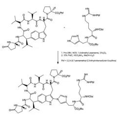 - ^ a b c d e f Ma, Bing; Banerjee, Biplab; Litvinov, Dmitry N; He, Liwen; Castle, Steven L (2010). "Total synthesis of the antimitotic bicyclic peptide celogentin C". J Am Chem Soc. 132 (3): 1159–1171. Bibcode:2010JAChS.132.1159M. doi:10.1021/ja909870g. PMC 2810426. PMID 20038144.
