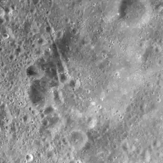 This is a worn and eroded crater formation, particularly along the western rim where a pair of parallel marks (either grooves or crater chains) cross the inner wall, running to the south-southeast. No impacts of note lie along the rim or crater interior, although the side is also somewhat damaged along the northeast. The crater is otherwise unremarkable.