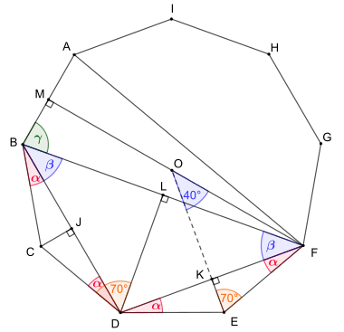 {\displaystyle {\begin{aligned}40^{\circ }&={\frac {360^{\circ }}{9}}\\70^{\circ }&={\frac {180^{\circ }-40^{\circ }}{2}}\\\alpha &=180^{\circ }-90^{\circ }-70^{\circ }=20^{\circ }\\\beta &=180^{\circ }-90^{\circ }-(70^{\circ }-\alpha )=40^{\circ }\\\gamma &=140^{\circ }-\beta -\alpha =80^{\circ }\end{aligned}}}
