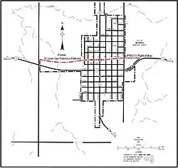 The townsite was platted in 1904 by L. R. Kershaw, who was an attorney and an immigration agent for the Frisco. He named the town after H. E. Morris, a Frisco executive.[6] Many of the street names in Morris are named after towns that were familiar to Kershaw from his home state of Illinois. Kershaw was also the founder of two of the earliest banks in Morris, Indian Territory: The Farmer's State Bank of Morris in 1905 and the First National Bank of Morris in 1907. Morris's later history includes bank robberies, the most talked about being those by Charles Arthur "Pretty Boy" Floyd, who was popular in the Morris area.[5]