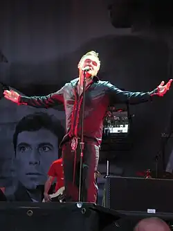 As frontman of the Smiths, Morrissey—described as "lanky, soft-spoken, bequiffed and bespectacled"[77]—subverted many of the norms that were associated with pop and rock music.[78] The band's aesthetic simplicity was a reaction to the excess personified by the New Romantics,[79] and while Morrissey adopted an androgynous appearance like the New Romantics or earlier glam rockers, his was far more subtle and understated.[80] According to one commentator, "he was bookish; he wore NHS spectacles and a hearing aid on stage; he was celibate. Worst of all, he was sincere", with his music being "so intoxicatingly melancholic, so dangerously thoughtful, so seductively funny that it lured its listeners ... into a relationship with him and his music instead of the world."[81] In an academic paper on the band, Julian Stringer characterised the Smiths as "one of Britain's most overtly political groups",[82] while in his study of their work, Andrew Warns termed them "this most anti-capitalist of bands".[83] Morrissey had been particularly vocal in his criticism of then-Prime Minister Margaret Thatcher; after the October 1984 Brighton hotel bombing, he commented that "the only sorrow" of it was "that Thatcher escaped unscathed".[84] In 1988, he stated that Section 28 "embodies Thatcher's very nature and her quite natural hatred".[84]