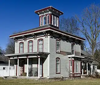 The Morse–Scoville House is an L-shaped two-story Italianate structure with a hipped roof and a single story, gable roofed rear addition. The exterior is clad in weatherboard, and a square cupola sits atop the roof. A single-story porch runs across the width of the front facade. The windows are tall and arched, with two-over-four panes.[2]