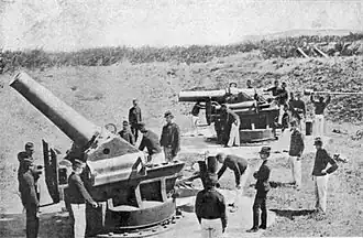 Although an older design the need for heavy artillery on the Western Front was so pressing that 86 mortars were converted to field use as siege mortars between 1915 and 1917. The conversion consisted of the steel firing platform of the coastal gun being placed on top of a platform made from wooden beams in the field.[3] The mle 1889 could be broken down into three loads for rail transport. Once at a rail station behind the front the mortars could be transferred to 600 mm (1 ft 11+5⁄8 in) narrow gauge rail wagons for the final leg to their firing positions.[4] These narrow gauge tracks were also used to re-position the mortars and bring up their ammunition and supplies. Once the firing platform had been assembled the mortar could be assembled in two hours by cranes and block & tackle.[3]