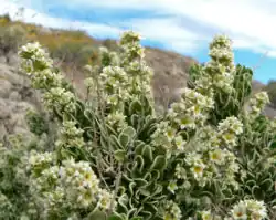 Mortonia is a small genus of flowering shrubs known as saddlebushes, sand paper bush or mortonias. These are rough, thorny, hairy shrubs with leathery leaves and panicles of fleshy white to purplish flowers. They bear nutlets containing 1 seed each. They are native to the southwestern United States and Mexico, where they are most abundant in dry regions.