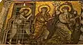 The last part of the interior to have mosaics added were the women's galleries between approximately 1300 and 1330.[1] These show angels and saints and their style agrees with Giovanni Villani's written evidence, which dates their completion to 1330 and probably dates the start of work to around 1300–1315. There are no art historical studies specifically on the mosaics of the women's galleries, though Venturi briefly notes that they were produced after 1300. The vault has a central motif of a starry sky, symbolic of the Empyrean, surrounded by angels with unclear attributes, possibly another set of angelic hierarchies.