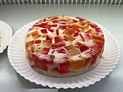 Mosaic gelatin is a gelatin dessert that is popular in Mexico and Brazil.[1][2] However, it is unclear if it is of Mexican or Brazilian origin.[2] It is sometimes called broken or stained glass gelatin due to its appearance.[3] This dessert is sold at fairs, markets, plazas, and food carts.[1] It can even be found in upscale restaurants.[4] It is popular amongst individuals of all ages,[1] but particularly children because of its colorful, attractive appearance.[2] It can be served at special occasions, and is often found at birthday parties for children.[1][3][5][6] It is a relatively simple and inexpensive dessert to prepare.[4][5]