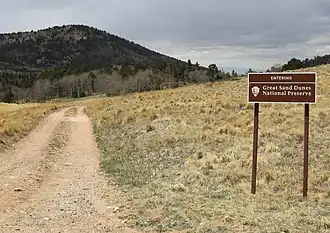 Mosca Pass Trail, which starts near the Great Sand Dunes National Park visitor center and is impassable to vehicles, lies on the west side of the pass, and Forest Road 580[2] begins and heads east from the top of the pass, becoming County Road 580 after passing the national forest boundary. The terrain is a mix of montane meadows, ponderosa pine woodlands, and Douglas-fir forest.[3]