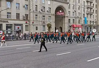![]() The Special Exemplary Military Band of the Guard of Honor Battalion of Russia during the parade on Tverskaya Street. | |