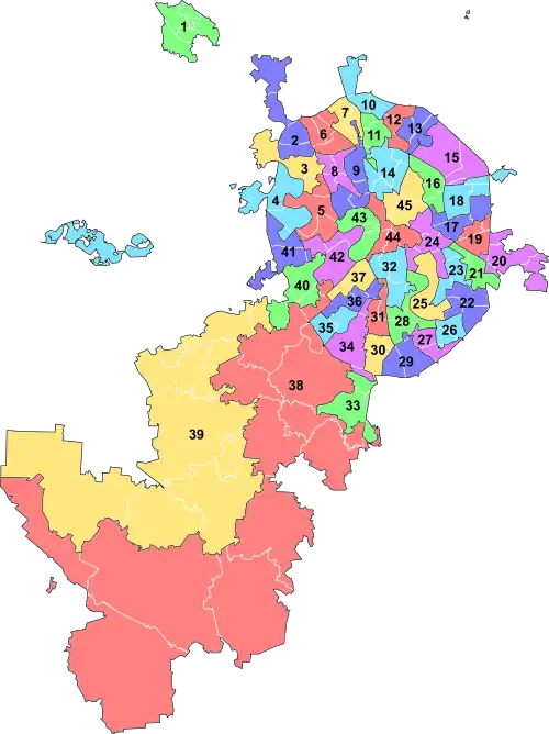 The Moscow City Duma consists of 45 deputies who are elected for five-year terms from single-member districts.[1]