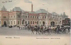Belorussky railway station (Russian: Белору́сский вокза́л, IPA: [bʲɪɫɐˈruskʲɪj vɐɡˈzaɫ]) also referred to as Moscow–Passenger–Smolenskaya[1] (Russian: Москва́-Пассажирская-Смоле́нская, lit. 'Moskva-Smolenskaya'), Informally the whole station can be called as Moscow Belorusskaya (Russian: Москва Белорусская, lit. 'Moskva Belorusskaya'),[2] is a railway terminal of the Moscow Railway[3] located at the front of Tverskaya Zastava Square in Central Administrative Okrug, Moscow. The station is one of nine railway terminals of Moscow. It was opened in 1870 and rebuilt in its current form in 1907–1912.