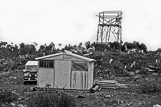 Prior to a fire tower and Stanley Hut being built, there was no shelter from sun, wind or cold. In 1952 the Forests Commission scrounged a decommissioned control tower from the RAAF at Bairnsdale Airfield, but the tubular-steel scaffold needed to transported and re-assembled by local FCV crews. There were many logistical difficulties erecting the heavy metal tower because there were no roads to the summit. The structure at Mt Nugong did not include the RAAF air traffic controllers cabin and was still open to the elements until a rudimentary shelter was added in about 1954.[7]