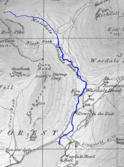 Mosedale Beck rises in Little Scoat Fell, it then flows south west until it reaches Ritson's Force waterfall. It then turns to the south and flows through the hamlet of Wasdale Head. It then flows through Down-in-the-Dale before it empties into Wast Water near the parallel Lingmell Beck.
