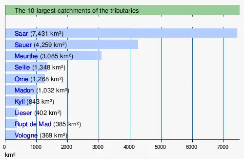 The catchment area of the Moselle is 28,286 km2 (10,921 sq mi) in area. The French part covers 15,360 km2 (5,930 sq mi), about 54 percent of the entire catchment. The German state of Rhineland-Palatinate has 6,980 km2 (2,690 sq mi), the Saarland 2,569 km2 (992 sq mi), Luxembourg 2,521 km2 (973 sq mi), Wallonia in Belgium 767 km2 (296 sq mi) and North Rhine-Westphalia, 88 km2 (34 sq mi).