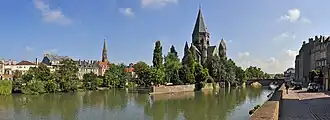 Moselle river flowing through Metz, with the church of Temple Neuf