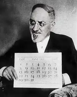 In 1912, he founded the International Almanak Reform League with Sir Sandford Fleming as honorary president. This organisation was relaunched in 1922 as the International Fixed Calendar League in an effort to gain adoption of his calendar by businesses and governments worldwide.[9] In 1925 Cotsworth met American entrepreneur George Eastman (1854 - 1932) who supported the plan and became its financial backer until his death. Eastman was also appointed president of the International Fixed Calendar League. The 13-month calendar was adopted by the Eastman Kodak Company, where it was used from 1928 to 1982.