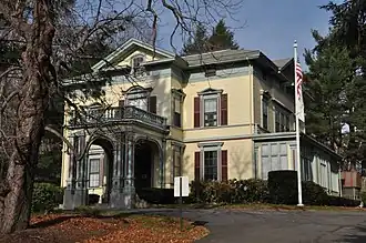 The 2+1⁄2-story wood-frame house was designed by local architect Alexander Rice Esty and built c. 1866 for Moses Ellis, a well-to-do local farmer. The house has a distinctive front facade, with a square projecting gable-end section from which a porte cochere protrudes. The gable of the projection has a nearly pedimented end, with an oval-arched window, a motif repeated in a slightly projecting gable on the house's right facade. In the early 20th century the house was home to a school for boys.[2]