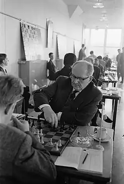 In 1950 Czerniak settled in Israel. In 1951, he won at Vienna (the 4th Schlechter Memorial). In 1951, he won at Reggio Emilia. In 1955, he won the Israeli Championship. In 1958, he took 2nd, behind Jan Hein Donner, at Beverwijk. In 1961, he tied for 1st–3rd with Milan Matulović and Petar Trifunović at Netanya.[8] In 1962, he tied for 1st–2nd with Hiong Liong Tan at Amsterdam (2nd IBM Tournament). In 1963, he tied for 2nd–3rd with Donner, behind Lajos Portisch, at Amsterdam (3rd IBM). In 1963, he took 2nd, behind Nikola Padevsky, at Polanica Zdrój (Rubinstein Memorial). In 1964, he tied for 4th–9th at Polanica Zdrój. In 1965, he won at Netanya.[9] In 1966, he tied for 7th–8th at Tel Aviv. In 1968, he tied for 2nd–3rd with Daniel Yanofsky, behind Robert Fischer, at Netanya.[10]