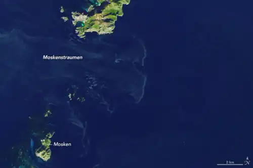 The currents are about eight kilometres (5.0 mi) wide[3] and suck in various small microorganisms, thereby attracting fish and fishing boats, which could be in danger even in modern times.[7] The flow currents are strongest around July–August. They can be clearly seen from a plane or the nearby 601-metre (1,972 ft) tall Lofotodden Hill on Moskenesøya.[8] There are regular tourist boat trips between Moskenesøya and Værøya.[9]