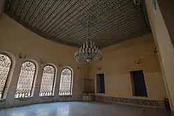 The mosque consists of a rectangle divided into two sections. The western section contains sanctuary area of the mosque and a sahn which is surrounded by a four-sided hallway covered by small domes built on marble pillars. Each dome is decorated with multicolored oil paintings with floral and geometric patterns and Quranic inscriptions. The sahn is covered by wooden roof with a center opening for ventilation, lighting and protection of the mosque from rain. The eastern section contains a prayer room and consists of two pillars, each of which contains two marble columns. The two sections divide the place of prayer into three corridors parallel to the qibla wall. The place of prayer is covered by a wooden ceiling decorated with multicolored oil paintings. The qibla wall is in the prayer room and marble mihrab can be found on the center of it.