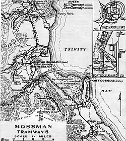 The district was served by two separate 2-foot (610 mm) gauge tramway systems.[18] Both at one time handled passengers and general goods, as well as sugar cane. Mossman district owes its present prosperity to these tramways which pioneered the first reasonable transport in the neighbourhood, for trafficable roads followed later.[17]